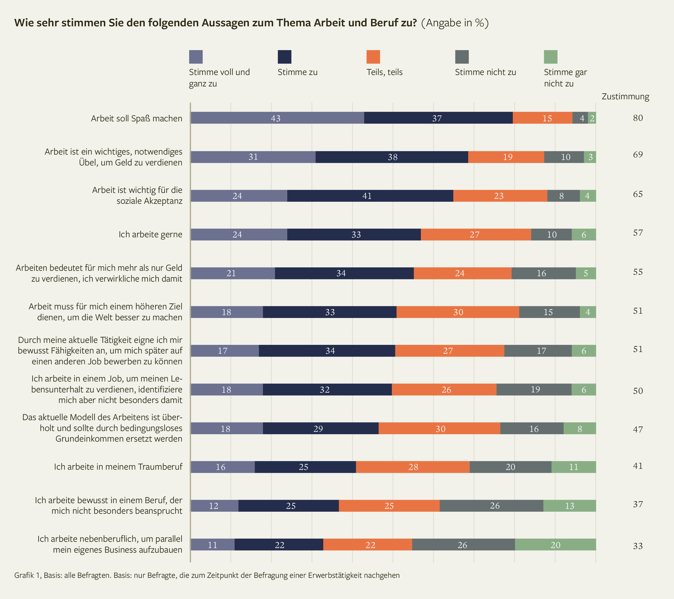 Für die meisten Menschen in Deutschland ist die berufliche Arbeit essenziell für ihre Existenz. Darüber hinaus verleiht sie Wertschätzung, ermöglicht Selbstverwirklichung und verschafft ein Gefühl der Zugehörigkeit– zu Kolleg*innen und zu einem großen Ganzen. Dennoch kann der Job auch belastend sein und gesundheitliche Probleme verursachen. Wie Arbeit von jungen Menschen aktuell empfunden wird, zeigt die Gesamtübersicht (s. Grafik).