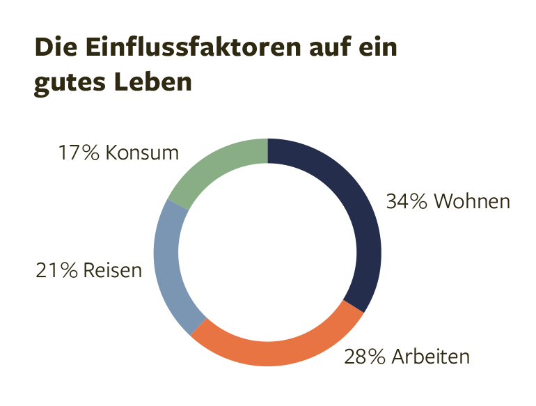 Zum Abschluss der Befragung wurden die Teilnehmer*innen gebeten, 100 Punkte auf die vier Bereiche Arbeiten, Wohnen, Reisen und Konsum zu verteilen – je nachdem, wie wichtig sie ihnen für ein gutes Leben sind.