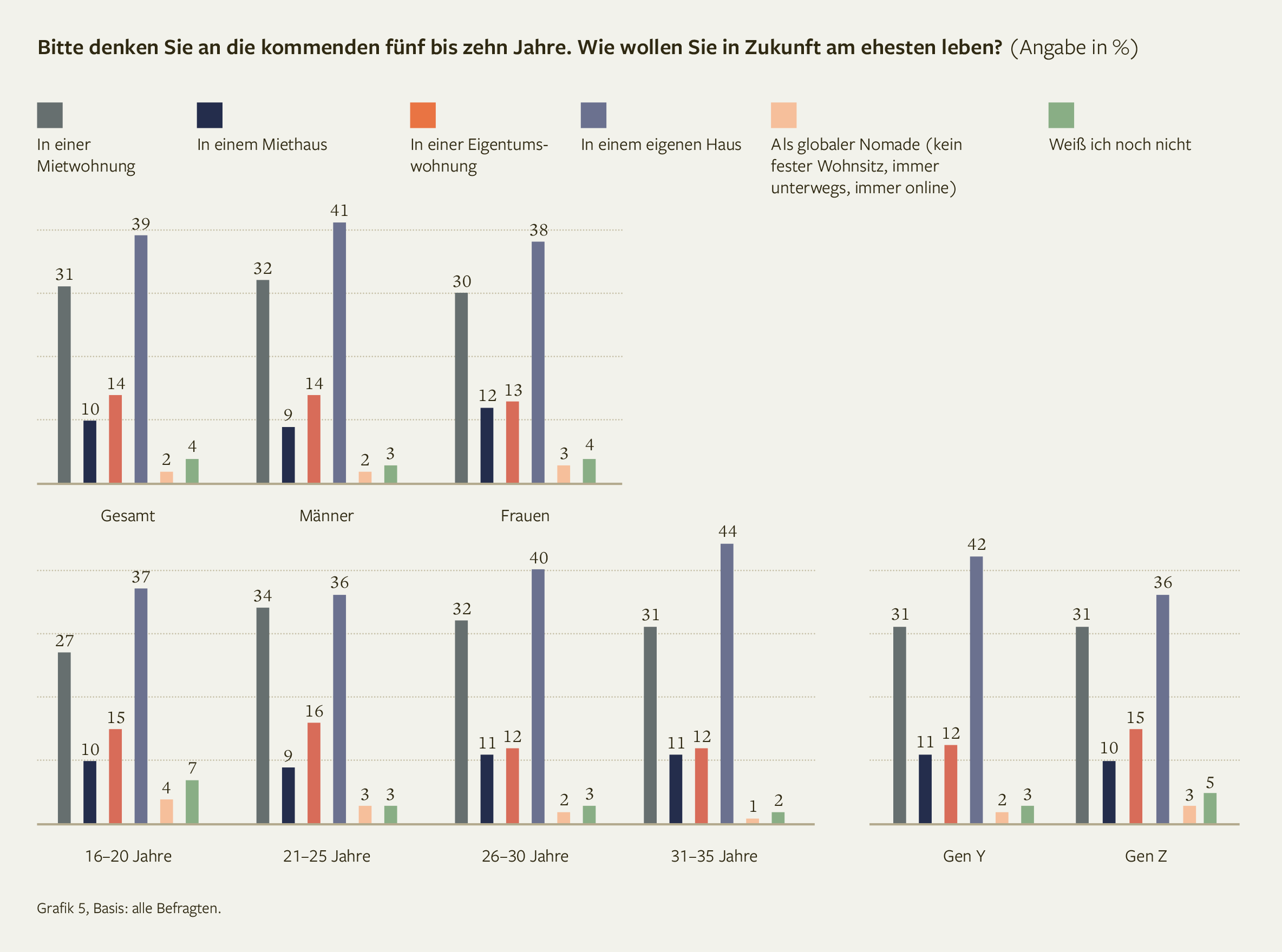 Auffällig ist, dass das Haus als Mietobjekt jedoch mit weniger als 10 Prozent rangiert – und die Wohnung als Eigentum bei lediglich rund 15 Prozent. Das lässt den Schluss zu, dass für jungen Menschen Haus und Wohnung Immobilienformen sind, in die sie langfristig investieren möchten: Wenn schon Haus, dann soll es das eigene sein. Wenn Wohnung, dann nur auf Zeit und für bestimmte Lebensabschnitte. Zwar lässt sich bei der Generation Z mit 16 Prozent eine leichte Tendenz zur Eigentumswohnung erkennen (gegenüber der älteren Generation Y mit 13 Prozent), dennoch kann allgemeingültig die Wohnung überwiegend als eine Art Übergangsform herausgelesen werden.