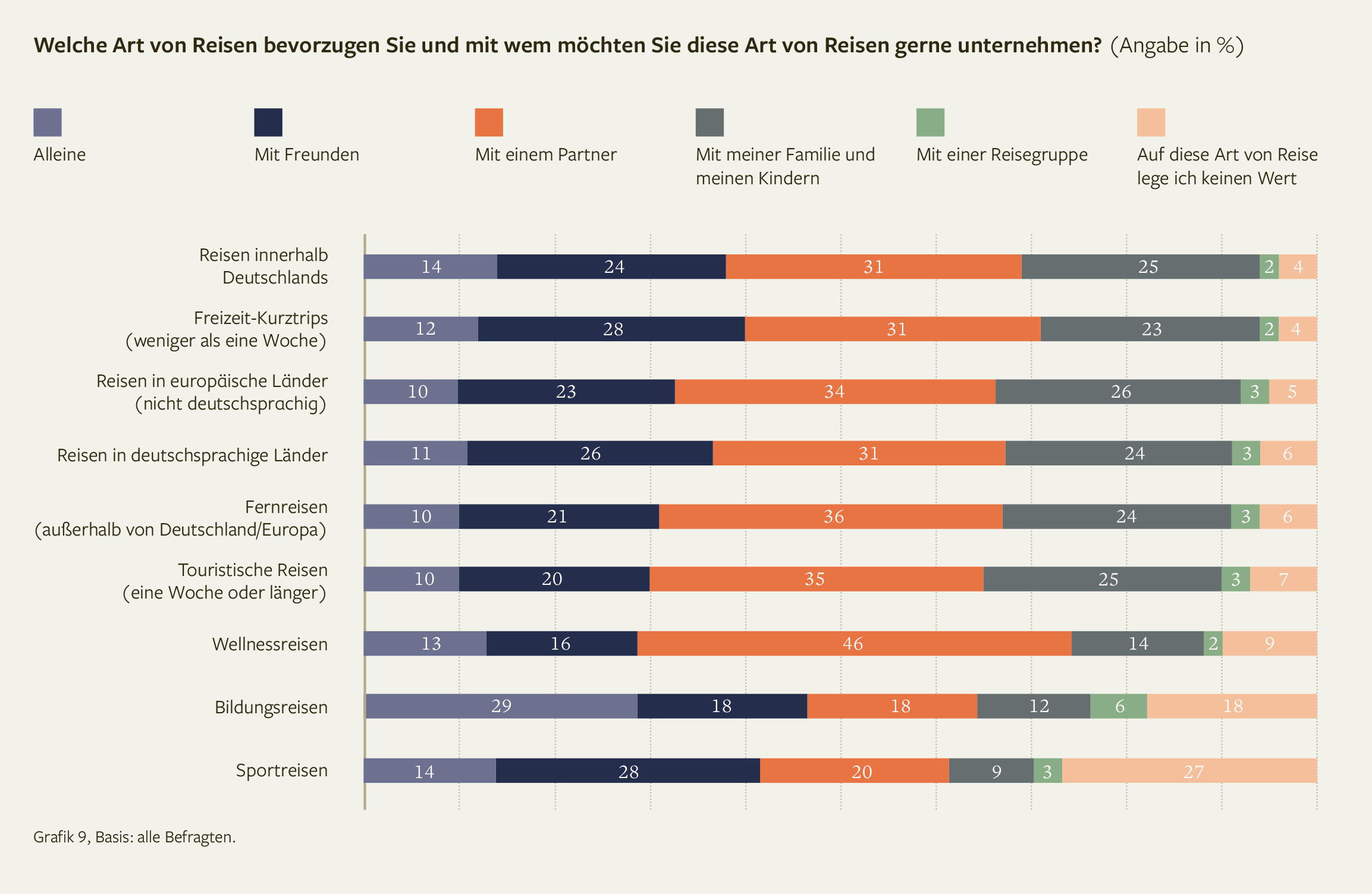 Beim Thema Reisen präsentiert sich ein aus wissenschaftlicher Sicht bekanntes Bild (s. Grafik): Obwohl innerdeutsche Reisen hier auf Platz eins rangieren, stehen bei den jungen Generationen Fernreisen mit Freunden, Lebenspartner*innen oder der Familie mit Kindern trotz Umweltbewusstsein und Klimakrise weiterhin hoch im Kurs.